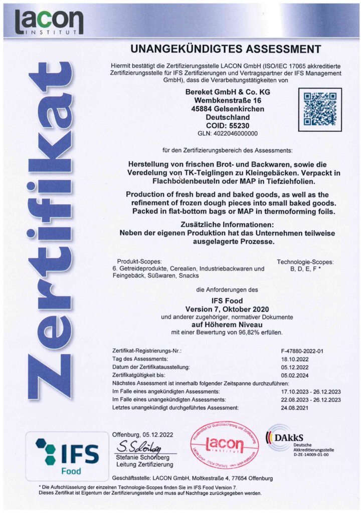 Wir arbeiten ausschließlich mit IFS-zertifizierten Betrieben zusammen, um sicherzustellen, dass wir unseren Kunden qualitativ hochwertige Produkte bieten können. Qualität und Lebensmittelsicherheit haben bei uns höchste Priorität.